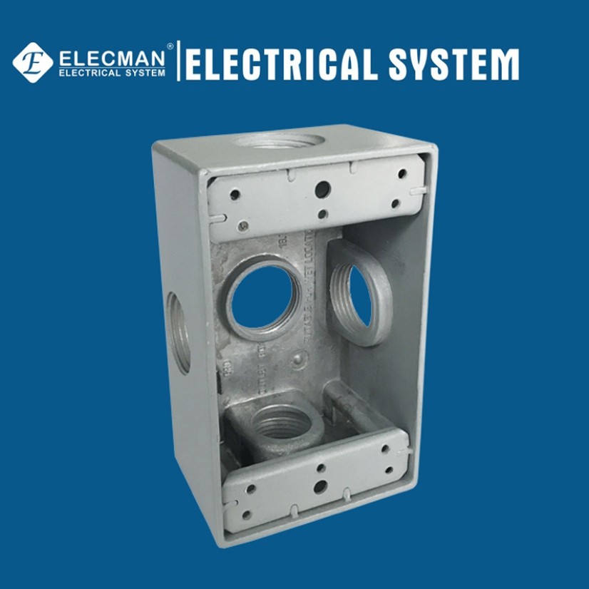 ELECMAN® 알루미늄 1 - 집단 비바람에 견디는 전기 박스는 습식이거나 축축하거나 마른 위치에 분실 회로 배선에서 사용됩니다. 내구성과 부식 저항성을 제공할 때, 그들은 싱글갱에 이용할 수 있, 2고 3무리와 라운드 아우트렛 박스입니다. 확장 어댑터들의 큰 다양성과 1와 두 집단 구성에서 자폐식 커버는 또한 이용 가능합니다.
