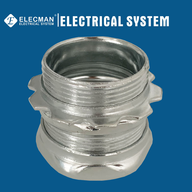 ELECMAN® 철강 EMT 압축 커넥터는 격리된 목구성과 함께 보안 적합성 때문에 강력강 건설, 스탬프 스틸 핵심을 가지고 있습니다. 이러한 사이즈와 구성에 이용할 수 있습니다. 거꾸로 할 수 있는 잠금용 너트는 박스와 구내에 보호용 코팅을 헤치며 나아가기를 계획했습니다. 녹음될 때 안에 단단한 애플리케이션을 콘크리트로 굳히세요. 신체와 잠금용 너트는 강철로부터 그리고 아연도금 표면으로 했습니다.
